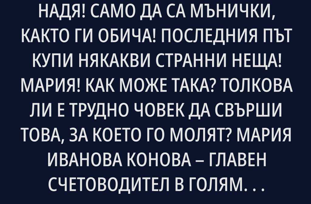 Мария Иванова Конова главен счетоводител в голяма компания, майка на две деца и напълно щастлива съпруга въздъхна и кимна в празното пространство, макар и да знаеше прекрасно, че майка ѝ не може да я види. Достатъчно беше, че Мария бе сигурна майка ѝ безпогрешно познава по гласа всяка реакция на дадените инструкции.