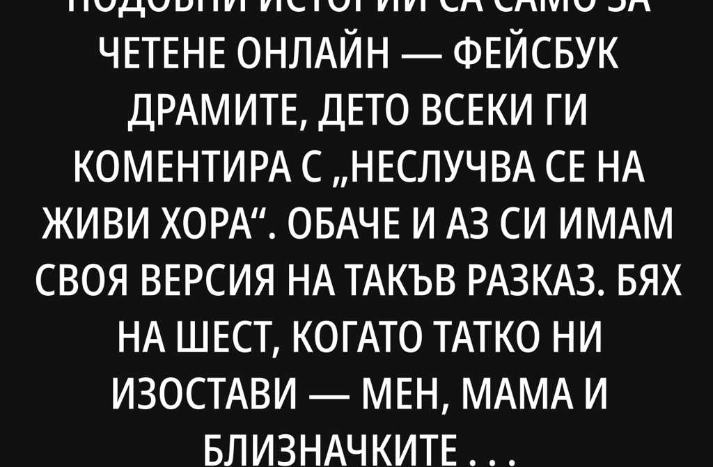 Винаги съм мислила, че подобни истории са само за четене онлайн фейсбук драмите, дето всеки ги коментира с неслучва се на живи хора. Обаче и аз си имам своя версия на такъв разказ.