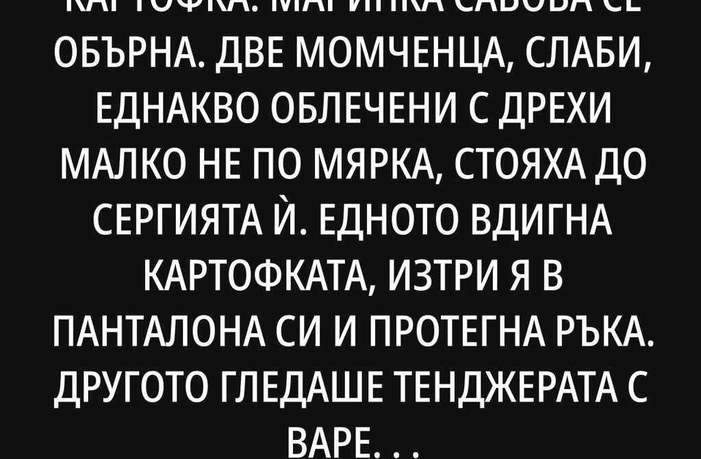 Маринка Савова се обърна. Две момченца, слаби, еднакво облечени с дрехи малко не по мярка, стояха до сергията ѝ. Едното вдигна картофката, изтри я в панталона си и протегна ръка. Другото гледаше тенджерата с варени картофи така, сякаш не беше яло от три дни.
