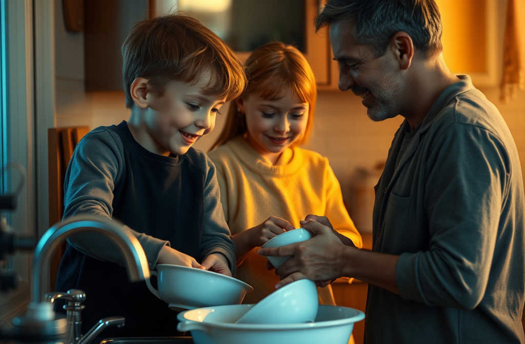 Стават. Вяра пуска крана, Косьо носи гъбата. Атанас взема хавлията и суши съдовете. Работят мълчаливо, но тишината вече е друга. Не празна, а изпълнена.