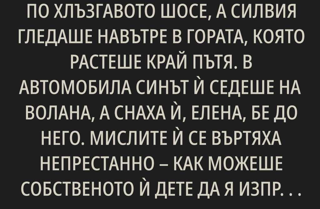 Колата се движеше спокойно по хлъзгавото шосе, а Силвия гледаше навътре в гората, която растеше край пътя. В автомобила синът ѝ седеше на волана, а снаха ѝ, Елена, бе до него. Мислите ѝ се въртяха непрестанно как можеше собственото ѝ дете да я изпрати в дом за възрастни? Къде беше сбъркала при възпитанието му? Може би не го бе обичала достатъчно, но все пак, винаги беше давала всичко от себе си и се стараеше да му осигури щастливо детство. Но Ангел винаги имаше своето мнение.