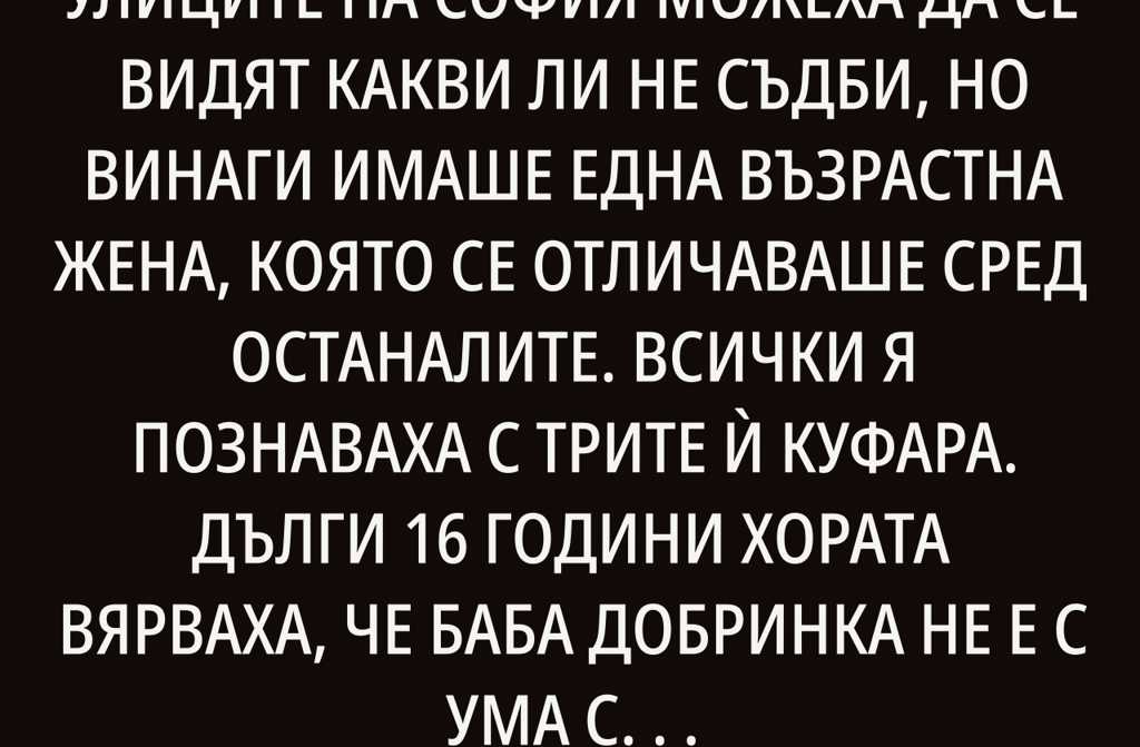 Преди много години, по улиците на София можеха да се видят какви ли не съдби, но винаги имаше една възрастна жена, която се отличаваше сред останалите. Всички я познаваха с трите ѝ куфара. Дълги 16 години хората вярваха, че баба Добринка не е с ума си, докато един ден съдбата не се обърна…
