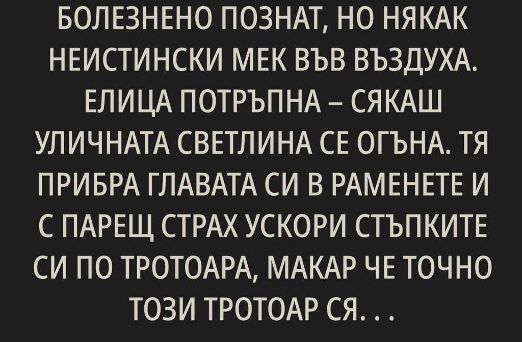 Елица потръпна сякаш уличната светлина се огъна. Тя прибра главата си в раменете и с парещ страх ускори стъпките си по тротоара, макар че точно този тротоар сякаш се спускаше нанякъде, като река мрак.