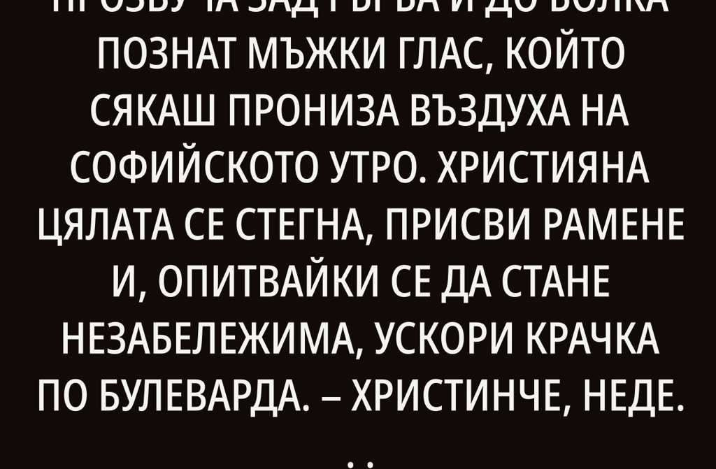 Християна! изведнъж прозвуча зад гърба ѝ до болка познат мъжки глас, който сякаш прониза въздуха на софийското утро.