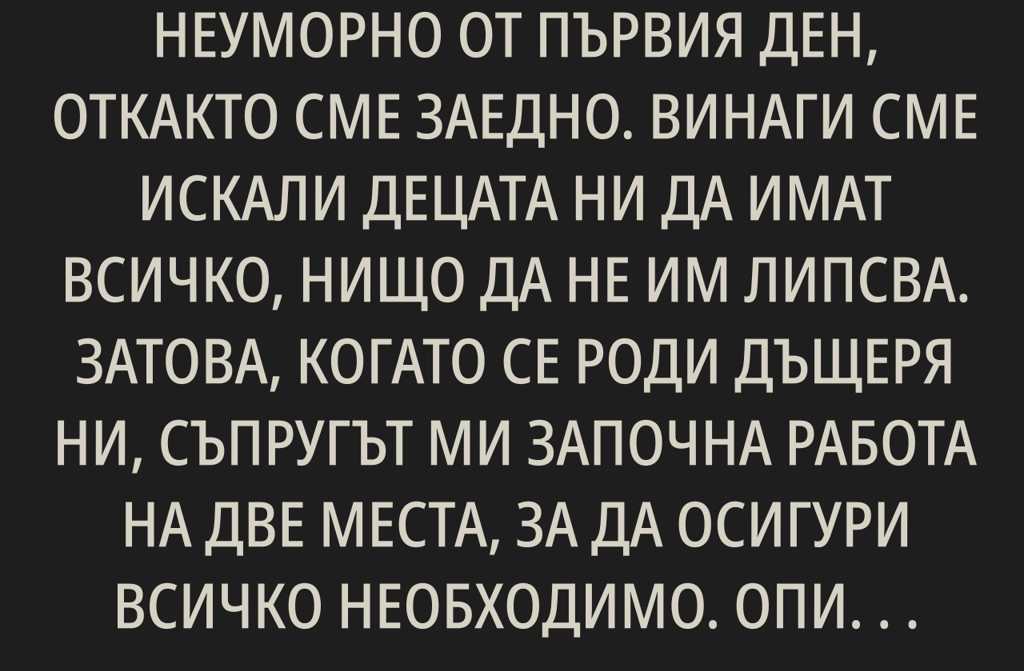 Съпругът ми и аз се трудехме неуморно от първия ден, откакто сме заедно. Винаги сме искали децата ни да имат всичко, нищо да не им липсва. Затова, когато се роди дъщеря ни, съпругът ми започна работа на две места, за да осигури всичко необходимо. Опитахме се да възпитаме дъщеря ни да бъде мила и внимателна. Времето се движеше ту бавно като сироп, ту стремглаво и сякаш с мигане на око дъщеря ни вече беше голяма.