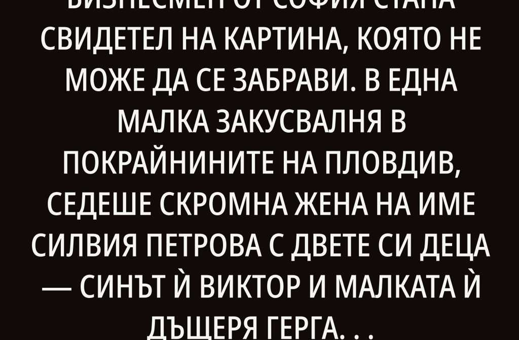 В една малка закусвалня в покрайнините на Пловдив, седеше скромна жена на име Силвия Петрова с двете си деца синът ѝ Виктор и малката ѝ дъщеря Гергана. Силвия беше вече над четиридесет, но умората я правеше да изглежда с години по-стара. Дрехите ѝ, макар и изпрани и спретнати, разкриваха дългите години на лишения. Още от сутринта бяха обикаляли квартала и събираха бутилки и вестници за стотинки. Всяка крачка бе премерена, всяка стотинка – от значение.