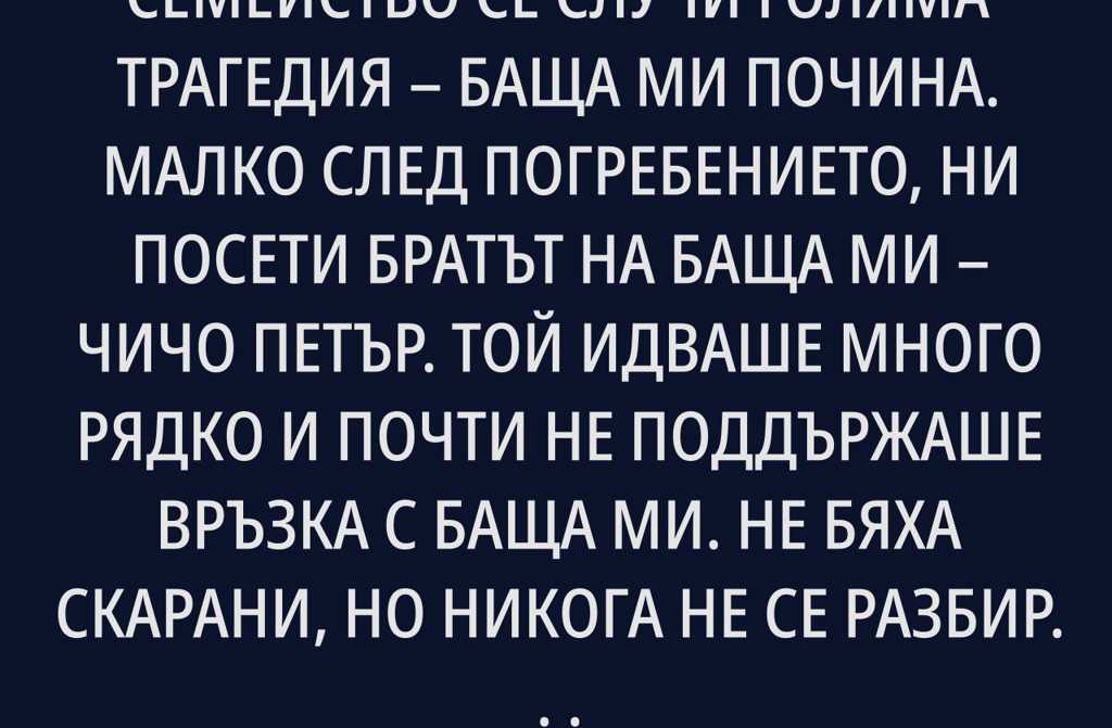 Малко след погребението, ни посети братът на баща ми чичо Петър. Той идваше много рядко и почти не поддържаше връзка с баща ми. Не бяха скарани, но никога не се разбираха напълно. Отношенията между тях винаги бяха хладни, всеки живееше своя живот.