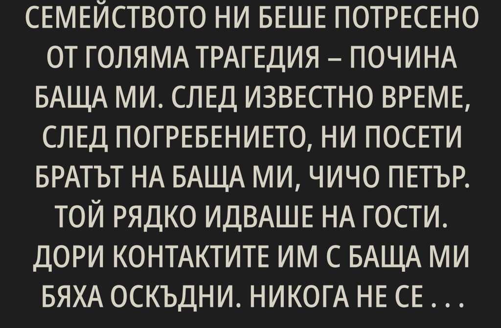 След известно време, след погребението, ни посети братът на баща ми, чичо Петър. Той рядко идваше на гости. Дори контактите им с баща ми бяха оскъдни. Никога не се караха, но и никога не бяха близки отношенията им винаги бяха студени и дистанцирани. Всеки живееше в свой свят.
