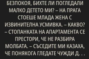 Леля Соня, извинявайте, че ви безпокоя, бихте ли погледали малко детето ми? На прага стоеше млада жена