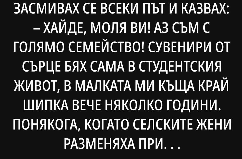 Бях сама в студентския живот, в малката ми къща край Шипка вече няколко години. Понякога, когато селските жени разменяха приказки за мен, не можех да сдържа усмивката си: