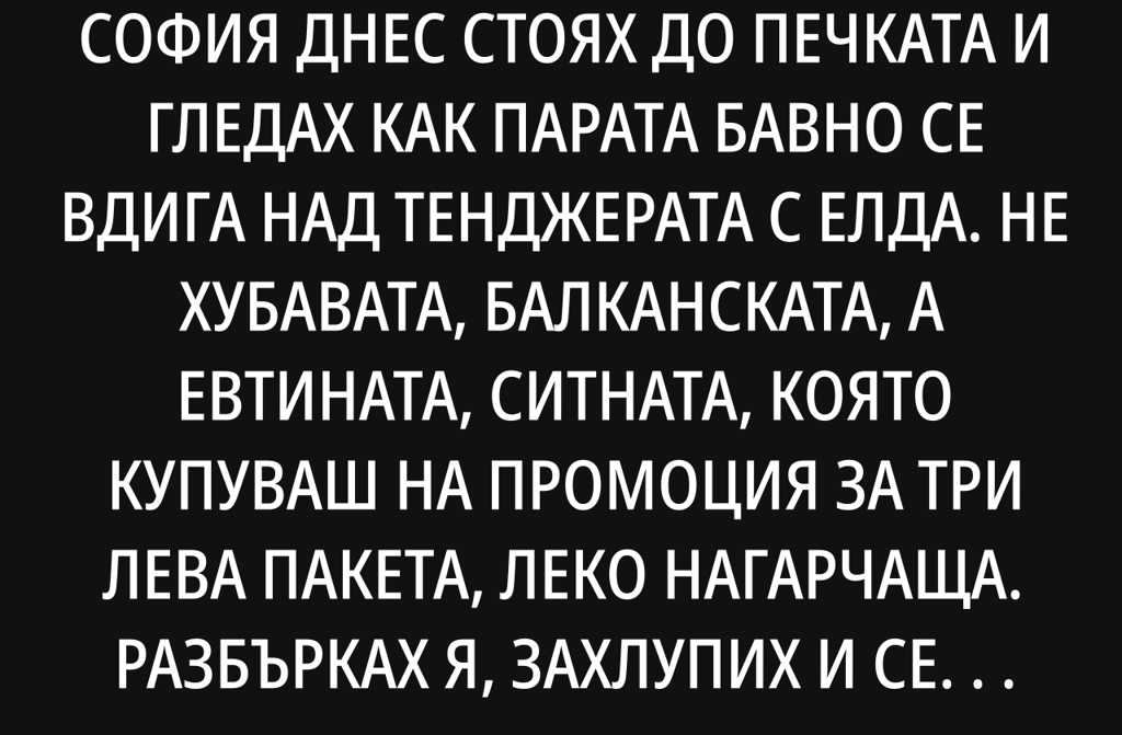 Днес стоях до печката и гледах как парата бавно се вдига над тенджерата с елда. Не хубавата, балканската, а евтината, ситната, която купуваш на промоция за три лева пакета, леко нагарчаща. Разбърках я, захлупих и се облегнах на стария Мраз, който вече гърми така, че ми се струва, че дружелюбно ми приглася.
