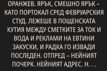 През прозореца се виждаше един от онези социалистически блокове на улица Искър пететажна панелка, тополи, които всяка пролет запълват малките прозорчета с пух, павилион за цветя на ъгъла. Тук съм вече дванадесет години и всичко около мен стана част от мен самата като мазолът на петата или като навика да прескачам четвъртото скърцащо стъпало по стълбите.