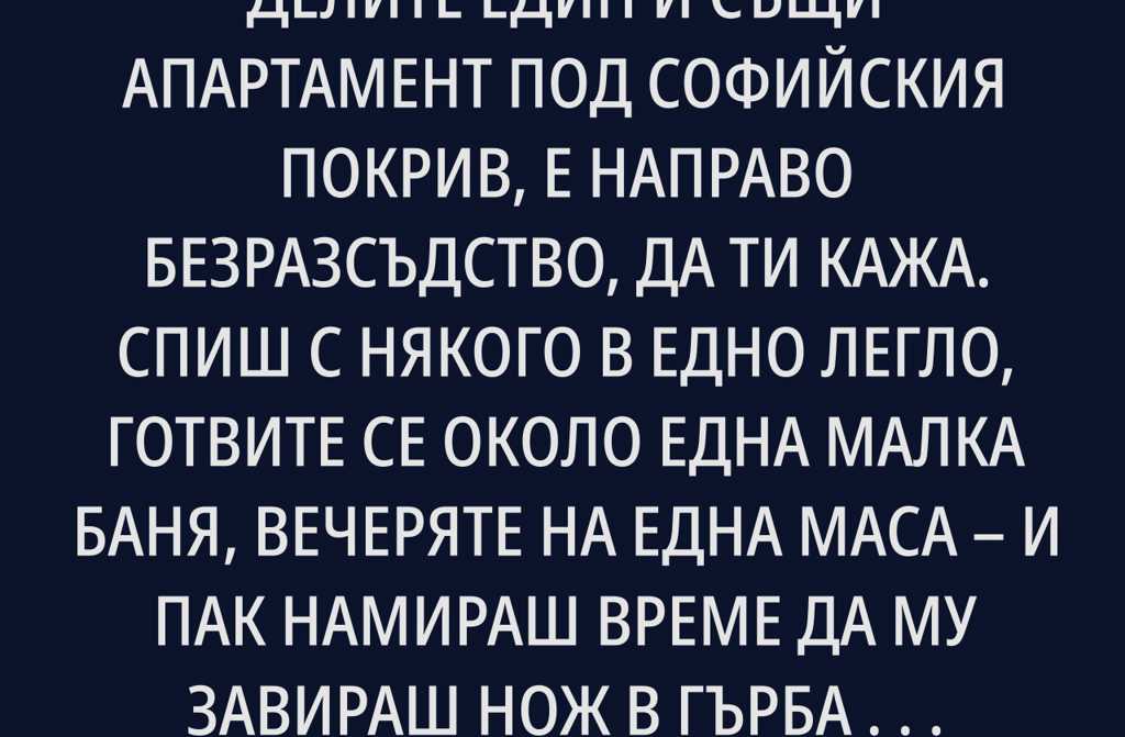 Да кръшкаш на някого, докато делите един и същи апартамент под софийския покрив, е направо безразсъдство, да ти кажа. Спиш с някого в едно легло, готвите се около една малка баня, вечеряте на една маса и пак намираш време да му завираш нож в гърба било то с флирт в месинджъра или, не дай си Боже, в чужди ръце. После кротко се прибираш обратно в чаршафите, които още носят аромата на момичето, което ти има най-много доверие. Това не е обикновена лъжа. Това е премислено неуважение.