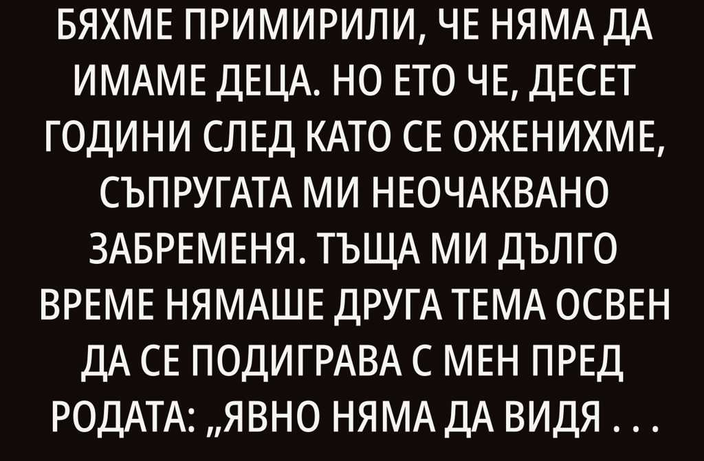 Тъща ми дълго време нямаше друга тема освен да се подиграва с мен пред родата: Явно няма да видя внуци от моя син заради тази снаха, дето не може да роди. Въпреки че от сина си, големия имат внучка дъщерята на брат на съпругата ми. Мразех да слушам подобни приказки, но няма как чувах ги не веднъж и два пъти.