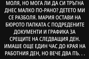 Тя е тук, с коня, отговори той, без да се замисля. Димитър се приближи, сваля шапката си и каза: Аз съм бащата ѝ, говори с плоска гласовка, без емоции.