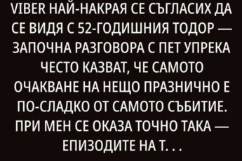 В съботните сутрини пиеха кафе на балкона, синът лаеше с котето, Емил понякога готвеше свински кюфтета или баница, а вечерите си споделяха деня не с големи думи, а с малки жестове. Тя не знаеше дали обича Емил онази голяма любов, но знаеше, че му вярва и го уважава. Благодарност, нежност и умиротворение.