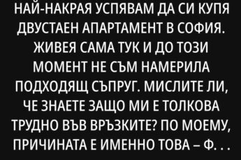 Краят на октомври в София има свой особено магичен полъх. Въздухът е леко хладен, носи аромат на мокри паднали листа и намек за първата слана. Такъв беше и този привечер, когато Весела, увита в огромен кариран шал, подскачаше на автобусната спирка на булевард “България”, загледана със завист към колите, които пълзяха по натоварения булевард. Телефонът й мълчеше без връзка, а в ума й се въртеше досаден рефрен от вчерашния епизод на любимия й сериал. Беше изпуснала автобуса. Както обикновено.