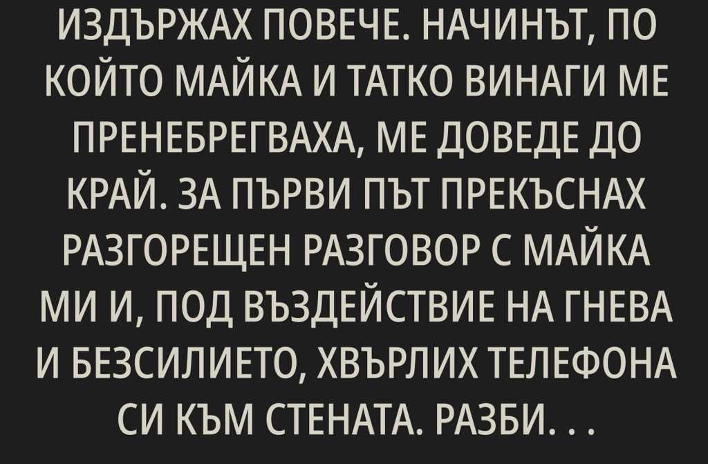 Днес не издържах повече. Начинът, по който майка и татко винаги ме пренебрегваха, ме доведе до край. За първи път прекъснах разгорещен разговор с майка ми и, под въздействие на гнева и безсилието, хвърлих телефона си към стената. Разби се. И знаех, че това е прекалено но не успях да овладея болката, съчетана с яд и усещане за безпомощност. Сълзите ми се стичаха по лицето, бурята вътре в мен беше по-силна от всякога.