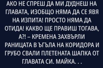 Жълтата бележка трепереше в ръцете ми: ИЗПРАЗВАНЕ. 60 дни. В портмонето шест лева и касова бележка за хляб. През нощта плаках истински не със звук, а с тялото си. Седях на прага и гледах звездите, които сякаш ми съчувстваха. Мразех го, мразех себе си, стените, града. Но сутринта будилникът звънна станах. Защото съм майка.
