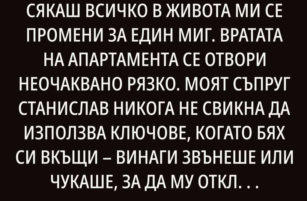 Вратата на апартамента се отвори неочаквано рязко. Моят съпруг Станислав никога не свикна да използва ключове, когато бях си вкъщи винаги звънеше или чукаше, за да му отключа. Но този път просто влезе. До него стоеше тя момичето, което бях виждалa само на снимки в профила му във “Фейсбук”, които той често забравяше отворени на служебния си лаптоп. Детелина по-млада, руса, със сресана прическа и неспокойни очи, които бягаха по ъглите на коридора.