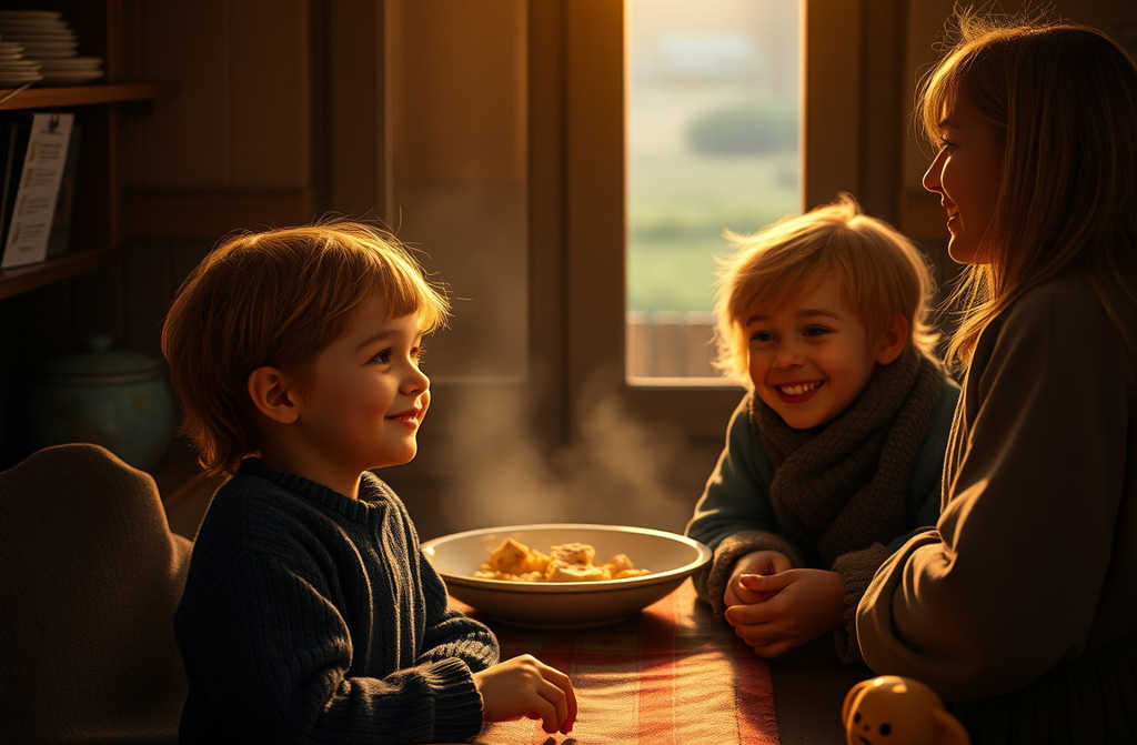 Момчето вече е изкъпано, сресано и нахранено, в центъра на кухнята, а сестрите завършват подготовката. Вече прилича на наистина рижава момче, около десетина години, чист, с червенобяла тениска за разкош голям надпис: “България”, с оръфани дънчици, боси крака скрити под табуретка.