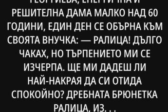 Вяра чете писмото със сълзи в очите. Баба я хвали, благодари, че ѝ е неудобно тя не го е правила за благодарност, а от обич. Ето моята молба приеми тази квартира като дар, няма с какво друго да ти се отблагодаря.