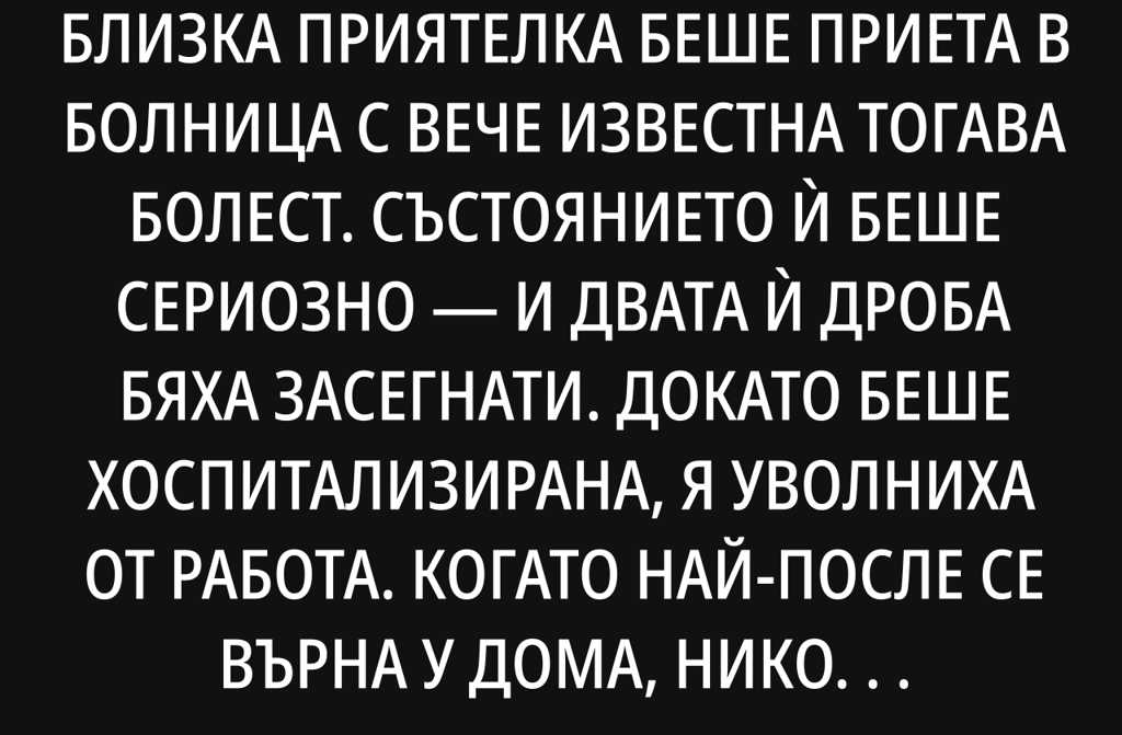 Преди доста години, една моя близка приятелка беше приета в болница с вече известна тогава болест. Състоянието ѝ беше сериозно и двата ѝ дроба бяха засегнати. Докато беше хоспитализирана, я уволниха от работа. Когато най-после се върна у дома, никой от близките ѝ не настояваше да търси веднага нова работа. Освен това тогава времената в България бяха трудни и всеки се държеше здраво за мястото си. Почти невъзможно беше да намериш добър пост, а работата като касиерка в квартален супермаркет не беше възможност за нея, тъй като здравето ѝ не позволяваше, след това което беше преживяла. Затова приятелката ми се оглеждаше внимателно за позиция по специалността си, като през това време работеше надомно, колкото можеше.
