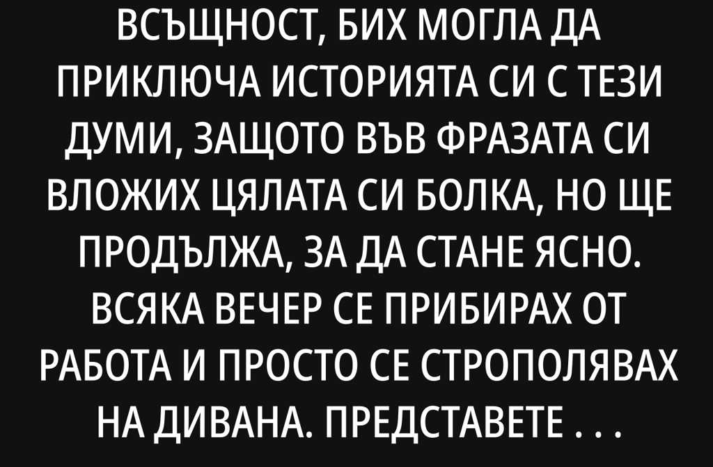 Бях толкова обидена, че не казах нищо по време на разговора им. Просто стоях там със стиснати юмруци. А той, щом затвори, с невинна усмивка каза ентусиазирано: Мама ни кани на вечеря и започна да изброява всичките й ястия, които понякога приготвя за вечеря. Исках да изкажа всичко, което мислех за свекърва си. А за десерт щях да добавя монолог на тема Защо не можеш да ядеш преди да си легнеш?. Но… пригласих се, сложих малко грим и отидохме на вечеря.