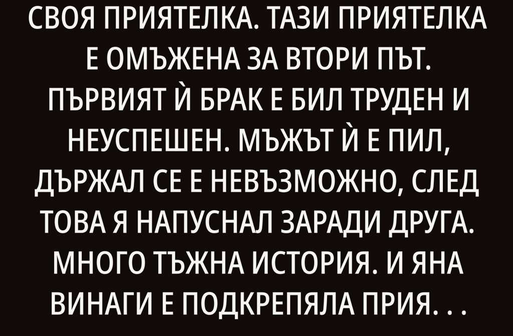 Но така става винаги. Този, заради когото си предал, накрая остава сам и не уважава предателя. Просто е нужно да спреш навреме шегите за чужда сметка. И да не оставиш приятеля си да бъде унижен в твоя дом. Може би тогава дори мъжът би започнал да уважава жена си и не би посмял да направи това, което направи.