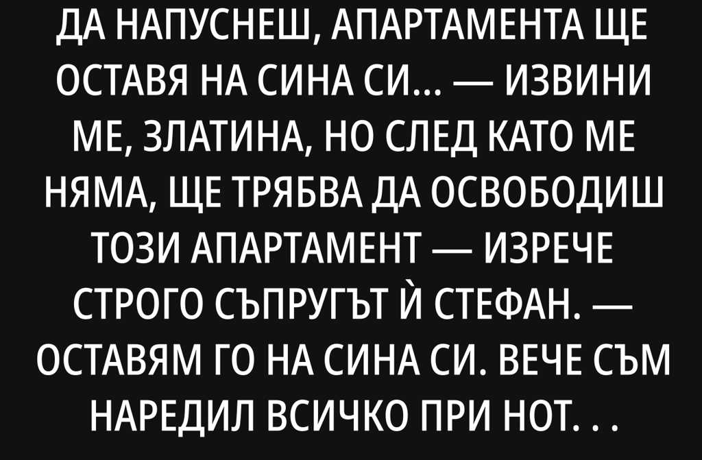 Извини ме, Златина, но след като ме няма, ще трябва да освободиш този апартамент изрече строго съпругът ѝ Стефан. Оставям го на сина си. Вече съм наредил всичко при нотариуса. Надявам се, не ми се сърдиш за това? Ти си имаш деца, те ще се погрижат за теб.