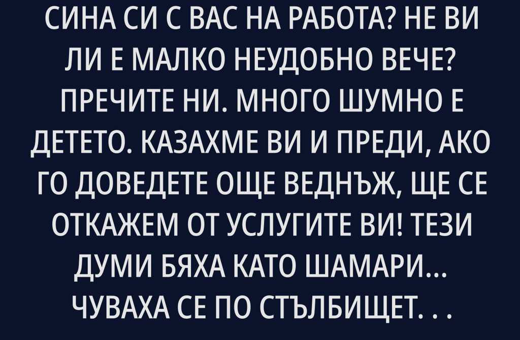 Госпожо, пак ли доведохте сина си с вас на работа? Не ви ли е малко неудобно вече? Пречите ни. Много шумно е детето. Казахме ви и преди, ако го доведете още веднъж, ще се откажем от услугите ви!