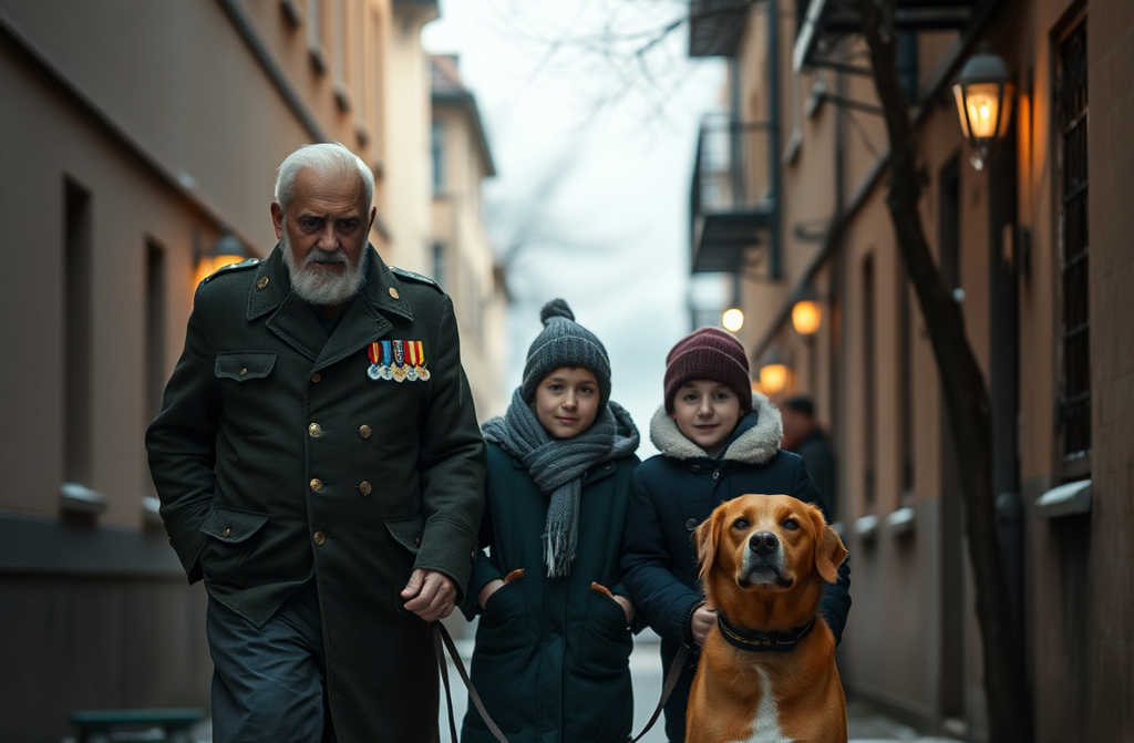 Всяка вечер из кварталните градинки може да се види необичайна група възрастен мъж с военна униформа, момче и рижав стар пес.