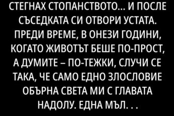 Заплеснах се да търся ключовете за колата. Реших да спра по пътя до една баничарница, да взема малко закуски. Чаят е задължителен, без него не може. Пристигнах, тя вече беше седнала да храни детето си, махна ми да се присъединя на масата. Седнах, разговорихме се, и по едно време тя ми казва: