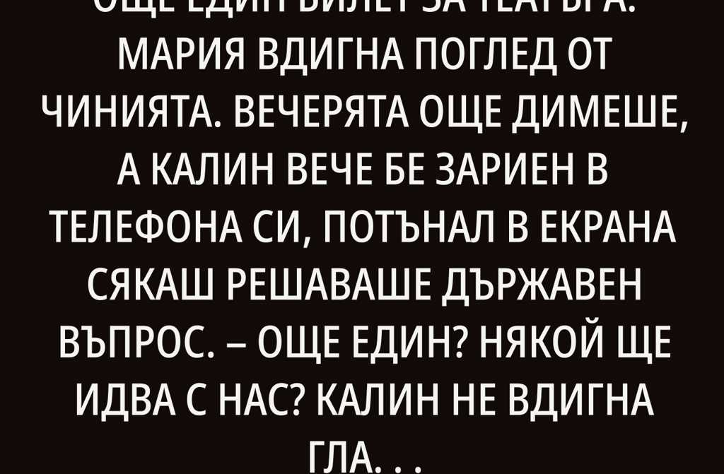 Мария вдигна поглед от чинията. Вечерята още димеше, а Калин вече бе зариен в телефона си, потънал в екрана сякаш решаваше държавен въпрос.