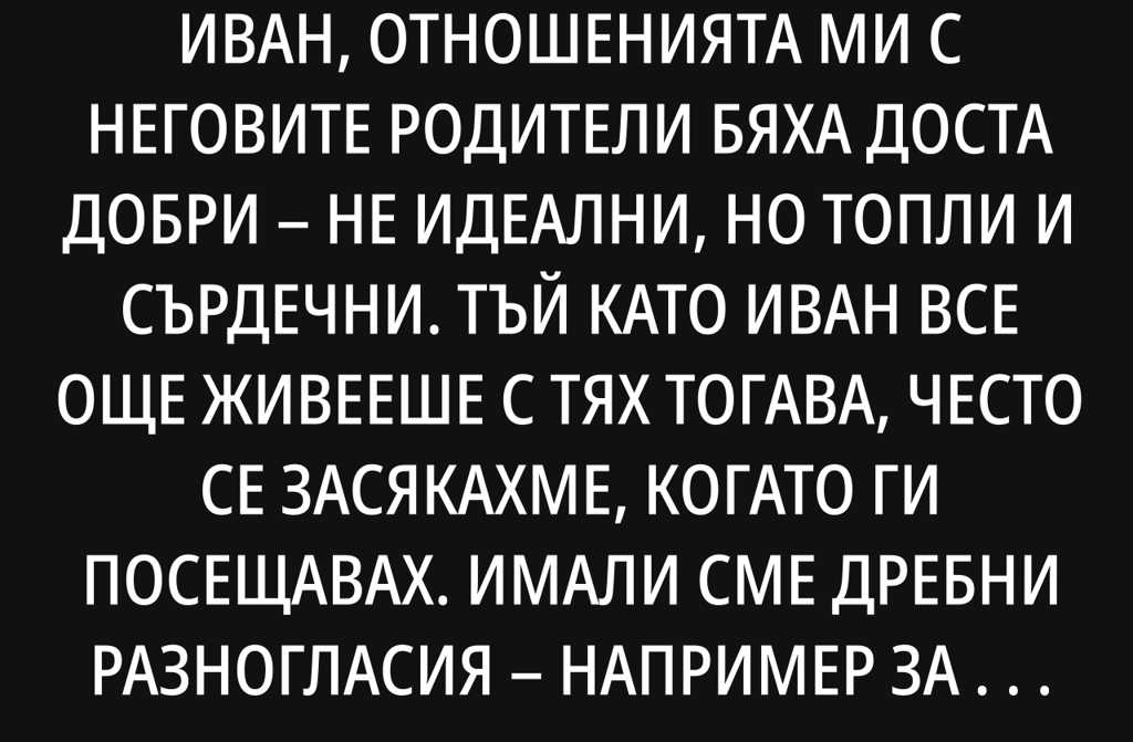 Преди да се омъжа за мъжа ми Иван, отношенията ми с неговите родители бяха доста добри не идеални, но топли и сърдечни. Тъй като Иван все още живееше с тях тогава, често се засякахме, когато ги посещавах. Имали сме дребни разногласия например за какво да пуснем по телевизията, но винаги се стараех да избягвам по-сериозни конфликти, като подкрепях свекърва ми Йорданка. Всичко вървеше гладко докато не дойде денят на сватбата ни.