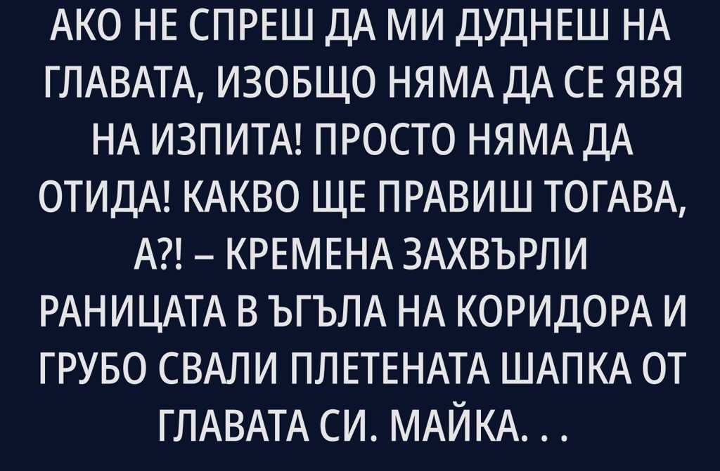 Омръзна ми! Стига! Ако не спреш да ми дуднеш на главата, изобщо няма да се явя на изпита! Просто няма да отида! Какво ще правиш тогава, а?! Кремена захвърли раницата в ъгъла на коридора и грубо свали плетената шапка от главата си.