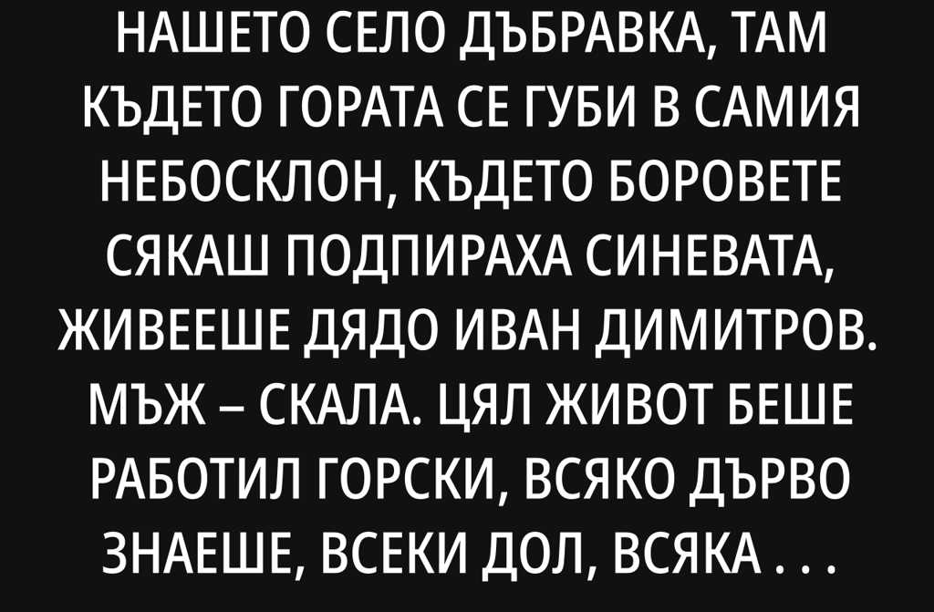 На края на нашето село Дъбравка, там където гората се губи в самия небосклон, където боровете сякаш подпираха синевата, живееше дядо Иван Димитров. Мъж скала.