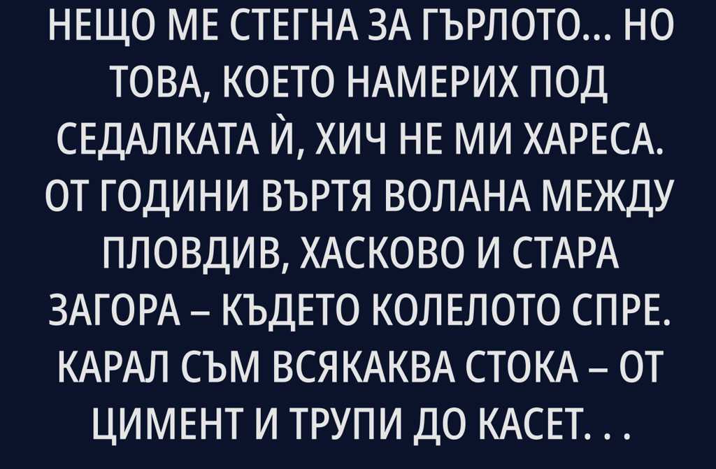От години въртя волана между Пловдив, Хасково и Стара Загора където колелото спре. Карал съм всякаква стока от цимент и трупи до касетки с череши и зъбни колела. Но такъв товар, какъвто ме споходи онзи ден, не бях возил никога.