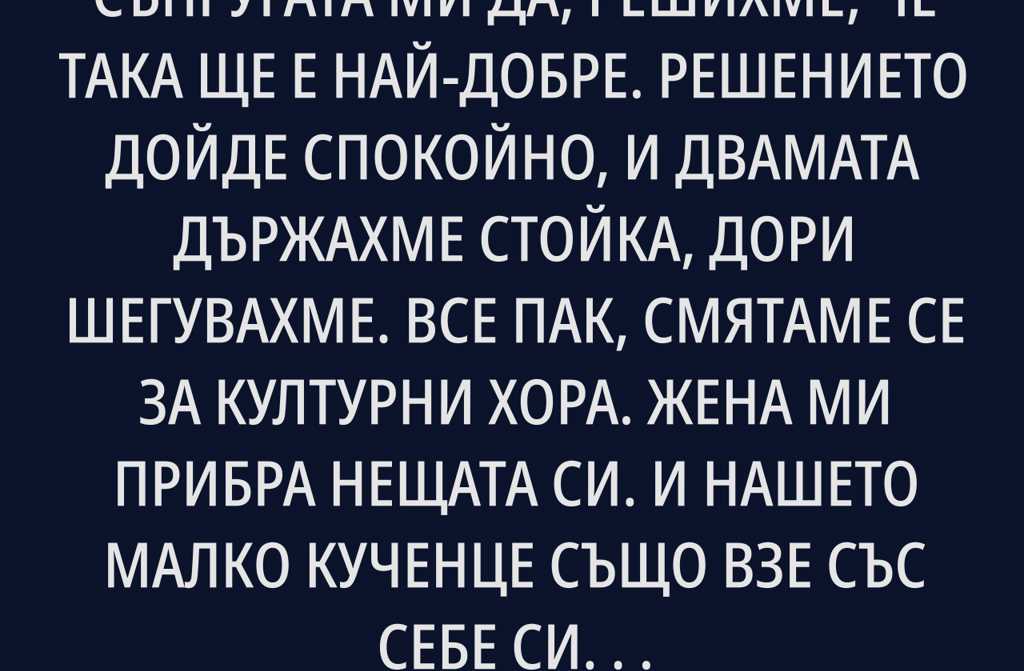 Да, решихме, че така ще е най-добре. Решението дойде спокойно, и двамата държахме стойка, дори шегувахме. Все пак, смятаме се за културни хора.