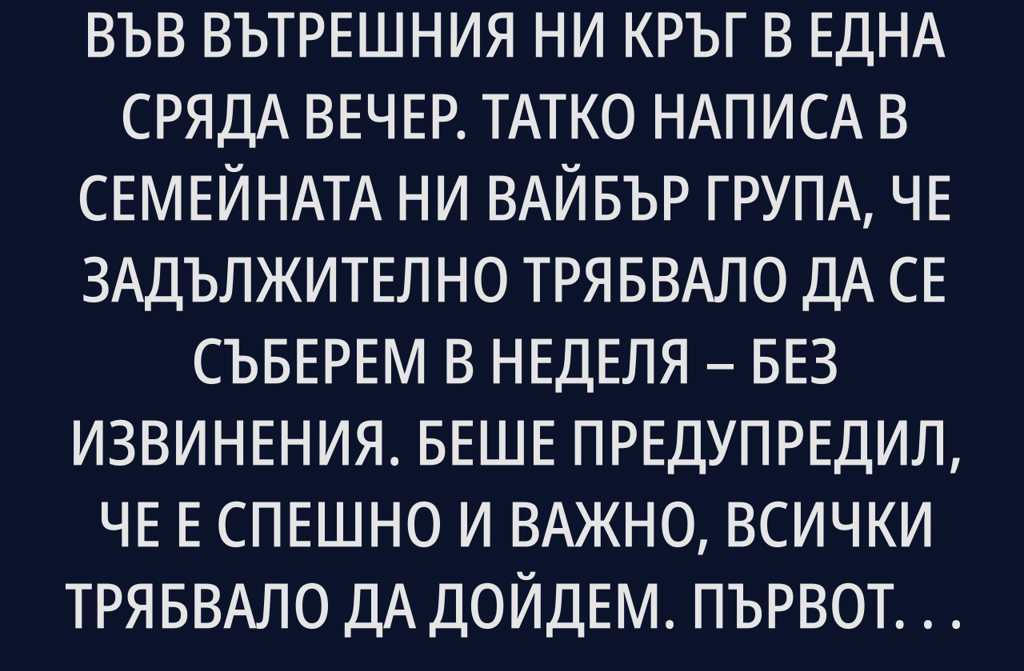 Знаеш ли, всичко се завъртя във вътрешния ни кръг в една сряда вечер. Татко написа в семейната ни Вайбър група, че задължително трябвало да се съберем в неделя без извинения. Беше предупредил, че е спешно и важно, всички трябвало да дойдем.