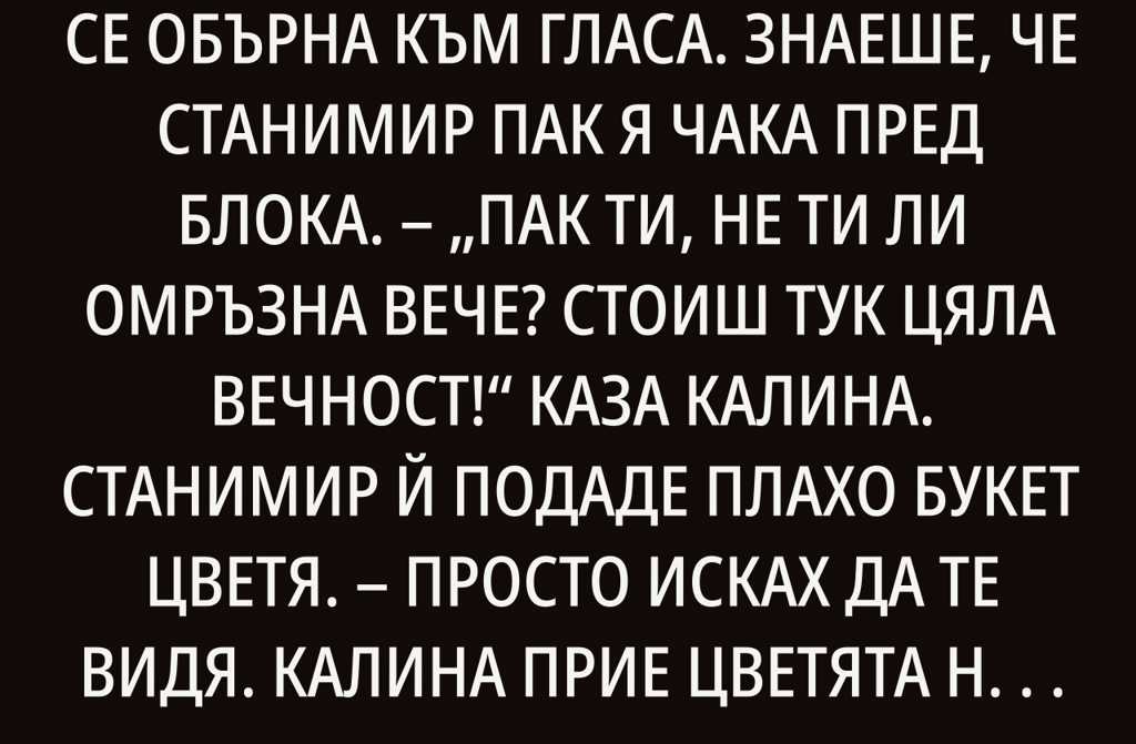 Калина, почакай. Момичето се обърна към гласа. Знаеше, че Станимир пак я чака пред блока. Пак ти, не ти ли омръзна вече? Стоиш тук цяла вечност! каза Калина. Станимир й подаде плахо букет цветя. Просто исках да те видя.