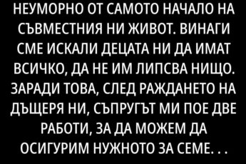 Стиснах устни. Дъщеря ми беше чистоплътна, трудолюбива, отлична домакиня. Още от дете беше свикнала с реда. Работеше, печелеше собствени пари. А този човек… само командваше.