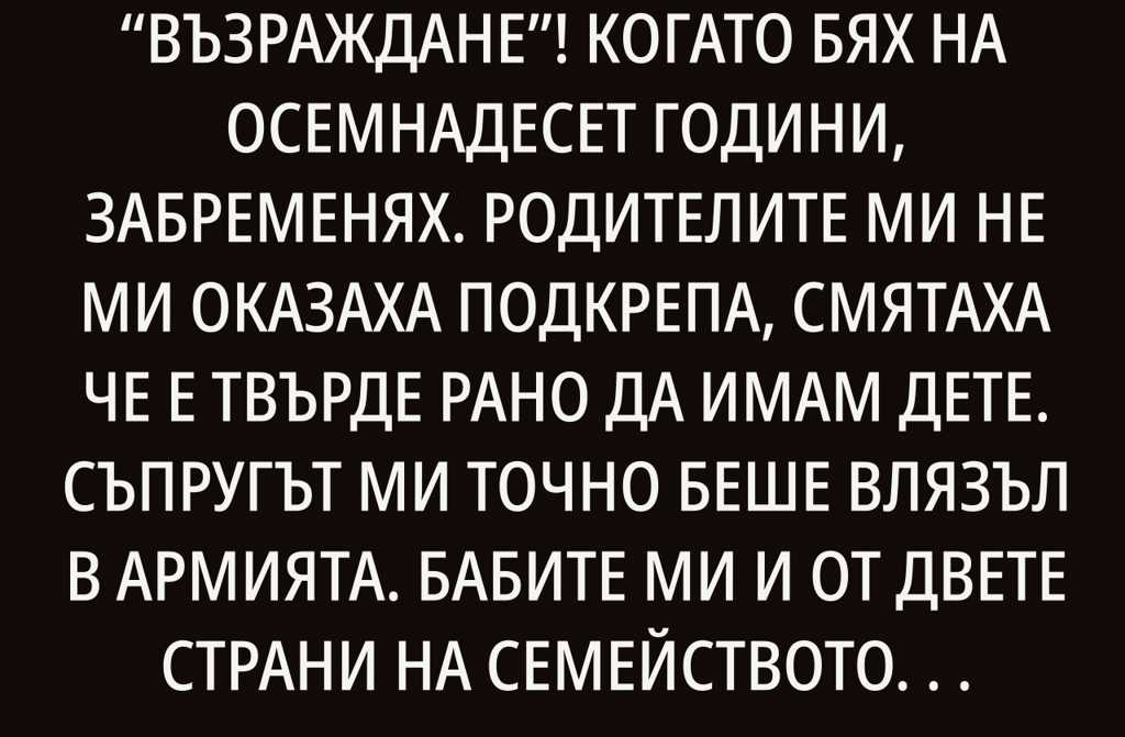 Когато бях на осемнадесет години, забременях. Родителите ми не ми оказаха подкрепа, смятаха че е твърде рано да имам дете. Съпругът ми точно беше влязъл в армията. Бабите ми и от двете страни на семейството ми казаха едно и също: