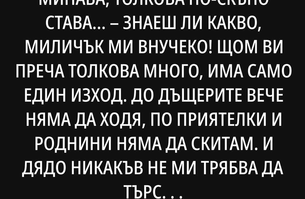 Знаеш ли какво, миличък ми внучеко! Щом ви преча толкова много, има само един изход. До дъщерите вече няма да ходя, по приятелки и роднини няма да скитам. И дядо никакъв не ми трябва да търся. Гледай ти, какво сте измислили! Да ме ожените на стари години!