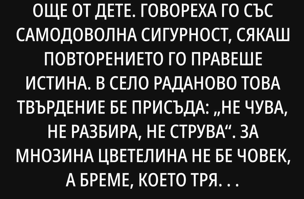 Говореха го със самодоволна сигурност, сякаш повторението го правеше истина. В село Раданово това твърдение бе присъда: не чува, не разбира, не струва. За мнозина Цветелина не бе човек, а бреме, което трябва да се мести от един ъгъл в друг.