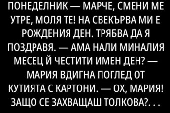 Като останах сама, все едно в мъгла. Стана изведнъж на Кольо му прилоша, почина преди да дойде бърза помощ. Децата още на следващата седмица разпродадоха всичко, домът на село, върнаха ме в София. Първите дни се хванах, че ставам в пет и обикалям апартамента като сънена.