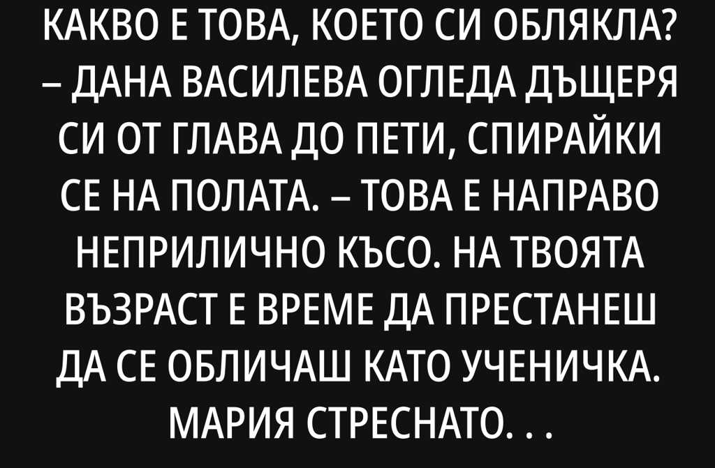 Какво е това, което си облякла? Дана Василева огледа дъщеря си от глава до пети, спирайки се на полата. Това е направо неприлично късо. На твоята възраст е време да престанеш да се обличаш като ученичка.