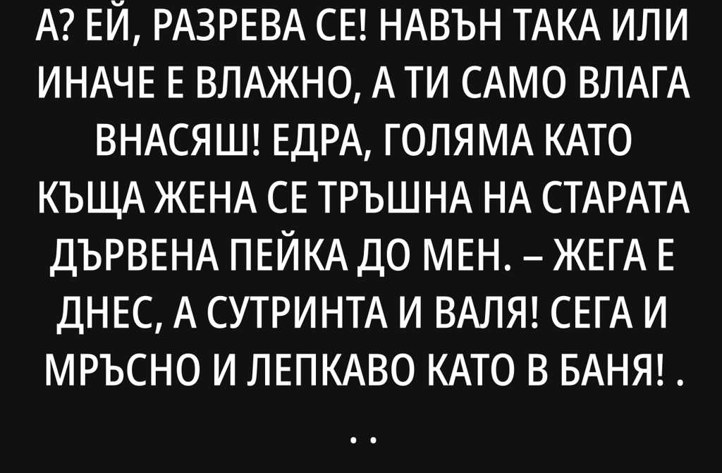 И ето ме сега, при жена, която е поне тройно по-обемна от тази от басейна. И не само че стои, тя и разправя без прекъсване! Но нямах сили от пейката да мръдна. Бях тук, във варненската градина до жп гарата, цял следобед първо плаках, после зяпах стената отсреща. Нямаше къде да отида. Волно-неволно, заслушах се в монолога на жената.