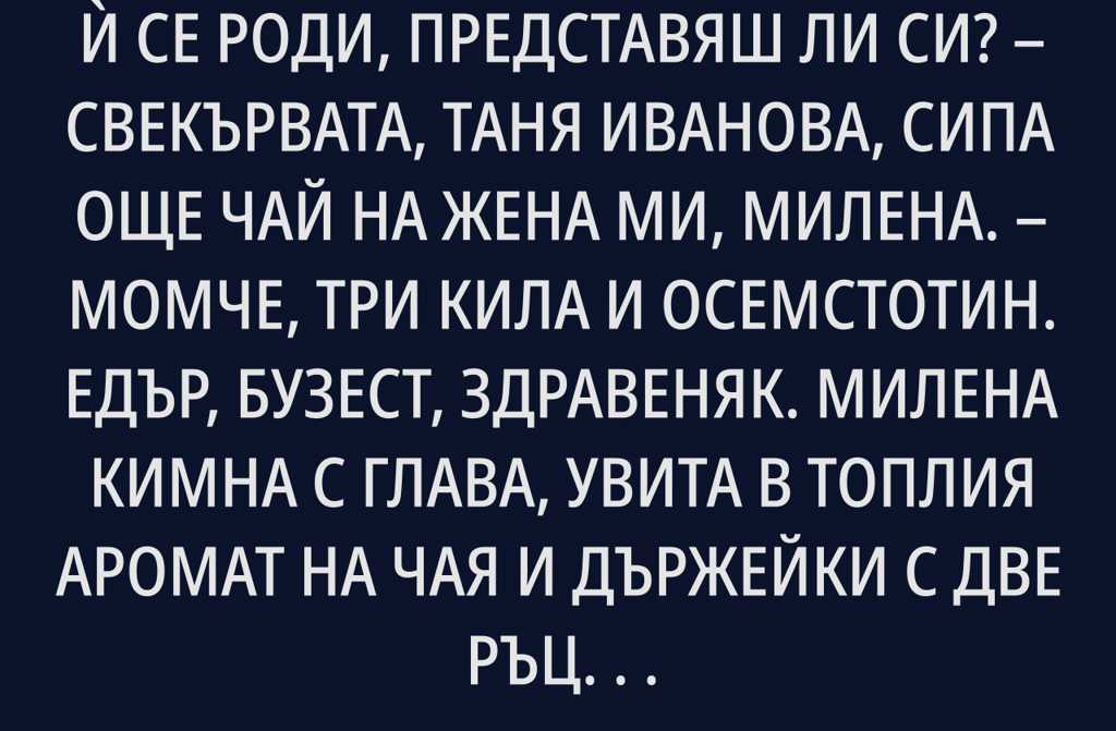 А на Гергана вече второ внуче ѝ се роди, представяш ли си? свекървата, Таня Иванова, сипа още чай на жена ми, Милена. Момче, три кила и осемстотин. Едър, бузест, здравеняк.