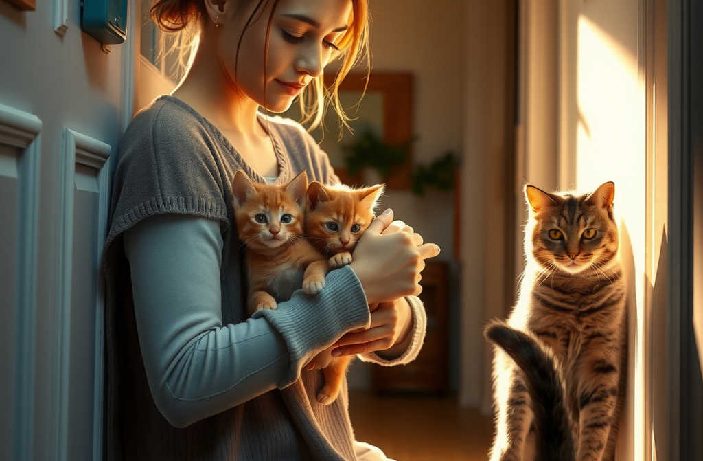 Котаракът явно очакваше някой да го приюти. Позволи да го погаля, но не и да влезе. Изведнъж хукна по стълбите, а след малко се върна с малко рижо коте в уста. Огромно и настръхнало, но само копие на себе си.